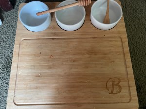 Use a proper charcuterie board and elegant utensils. My daughter bought me this one, and it comes with adorable dishes and spoons! You can see the honey dipper here too 🙂