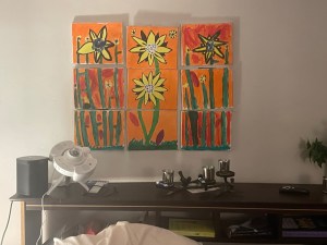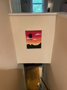 Canvases. My kids really got into doing their own masterpieces with oil paints in recent years. We like to get a variety of sizes to fit different spaces. This one my daughter made me for Christmas last year (see my handmade gifts from children post, coming out near the holidays!), and I love it- so colorful! A perfect spot for this is the stairway coming down from their bedrooms.