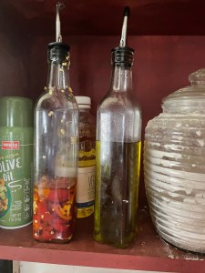 We see people using these all the time on cooking shows. I got this set of two, and use one for regular olive oil and the other for an infused oil with hot peppers. These are designed to give you just the right amount of oil to grease a frying pan. Instead of pulling out your bottle of oil, unscrewing the cap and getting the right amount, just lightly pour from this beautiful bottle. It really seems to get the exact correct amount! If I’m cooking something calling for more than a quarter cup of oil, I’d still use the bottle, so I do have that on hand as well. But for just lightly oiling something on a sauce pan (vegetables, burgers, chicken…) this is perfect, and looks so elegant.