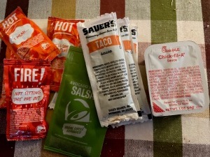 Sauces. Ketchups, barbecue sauce, taco sauce, salsa. Do they like restaurant sauces like Chick-fil-A dipping sauces, Taco Bell breakfast salsa or Olive Garden salad dressing? If you can’t find these in the grocery store then pick them up at the restaurants! A great excuse to stop for lunch when you’re out shopping 🙂  I think it’s cute/funny to put a few of the small packs of sauces in there.